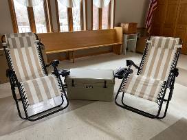 Yeti cooler and 2 Adjustable Steel Mesh Zero Gravity Lounge Chair Recliners with pillows