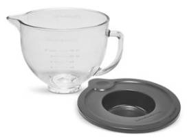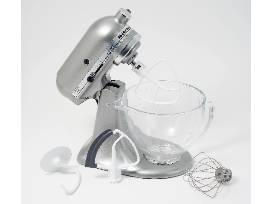 Includes Artisan stand mixer, 5-qt glass bowl with spout and handle, bowl lid, coated dough hook, coated flat beater, stainless steel wire whip, and Flex Edge beater