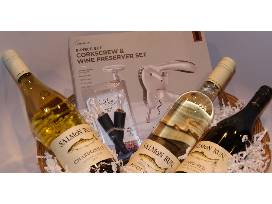 Includes a trio of Salmon Run Wine (Pinot Grigio, Chardonnay and Coho Red) a 6 piece Rabbit brand Corkscrew and Wine Preserver Set, plus a 2 pack AERAWINE Wine Aerator and Pourer.