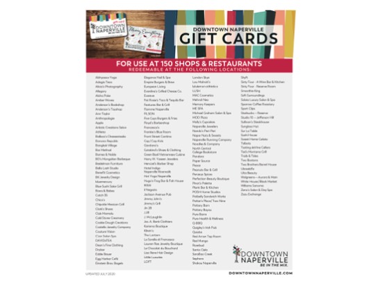 Downtown Naperville Gift Cards $250. Can be used at over 150 locations including restaurants, shops, hotels, spas, workout facilities.