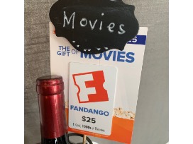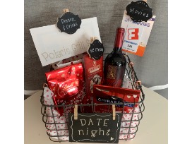Date night gift basket includes $100 to Polaris Grill, $25 Fandango movie card, $20 Cold Stone card, one bottle of Apothic Crush wine, Ghirardelli and Lindt Chocolates....in a cute wire basket.