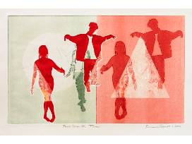 Emma Amos (1937-2020) was a pioneering artist, educator, and activist. A dynamic painter and masterful colorist, her commitment to interrogating the art-historical status quo yielded a body of vibrant and intellectually rigorous work. Influenced by modern Western European art, Abstract Expressionism, the Civil Rights movement and feminism, Amos was drawn to exploring the politics of culture and issues of racism, sexism, and ethnocentrism in her art. "It's always been my contention," Amos once said, "that for me, a black woman artist, to walk into the studio is a political act." Amos became a member of Spiral, an important African-American collective in 1964, but found that the effort for black representation in the art world often omitted women. She then became involved in various underground feminist collectives, including Heresies from 1982 to 1993, and the trailblazing Guerilla Girls group after its founding in 1985.