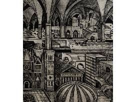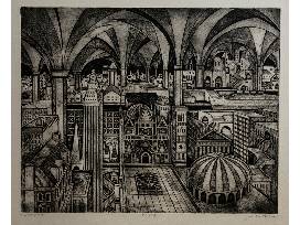 "One of the most useful printmaking techniques for my images is the collagraph, which I helped to develop. The plates for this method are generally made of mat board with gesso adhering paper, fabrics, cardboard and found objects to the mat board base. Razor blades can cut lines and other shapes to place on the base. From these ordinary materials, I can create city streets, mountains, canyons, pueblo dwellings, oil refineries, skyscrapers, and other constructions, either realistic or visionary."
