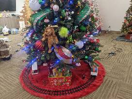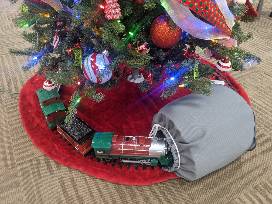 A toy train below the tree with various smaller Whoville themed gifts is also included.
