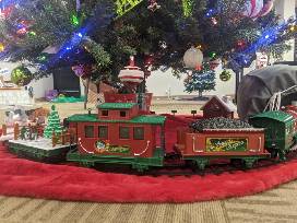 Dimensions: 7.5 ft. tall, 54 in. base diameter, tree skirt (60 inches), train (7.5 inches tall, 4.5 inches wide, over 18 feet of track