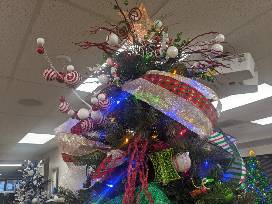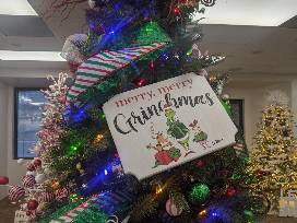 The tree is a dark green Colorado Spruce with a foot pedal to choose multi-colored lights, warm white lights, or changing lights. Decorations are red, white, and green ball ornaments, ribbons, and whimsical tree picks with grinch and Whoville ornaments and plushes, topped with a gold star.