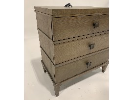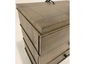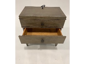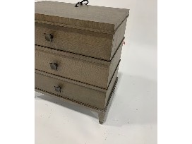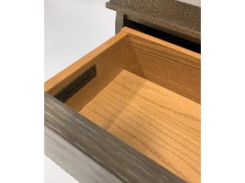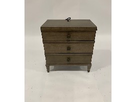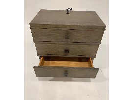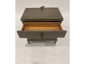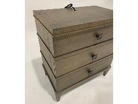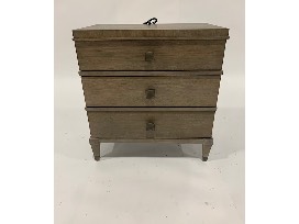 Features: three drawers; lift lid; drawers have English fronts and backs, wood glides; built in power outlet