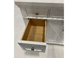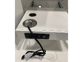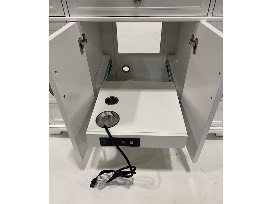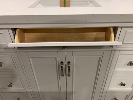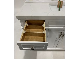 features: white Carrera quartz countertop and matching backsplash; single-hole faucet; brushed nickel hardware; storage drawer with premium soft-close drawer guides; storage drawer features drawer organizers; English dovetail front and back; under-mount cUPC rated white ceramic sink; stainless steel accessories; 1 pullout shelf with 2 power, 2 USB power hub with on/off switch