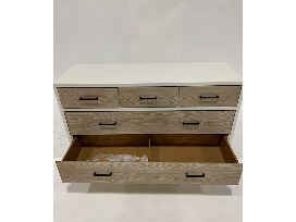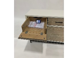 Features: left drawer has drop front with full extension metal drawer guides for media; top right drawer has removable felt tray; removable dividers in larger drawers