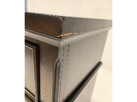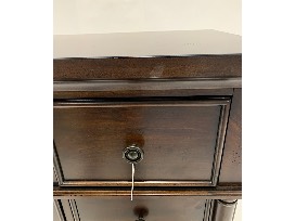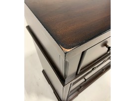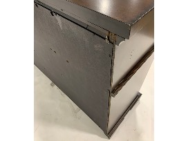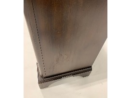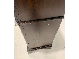 Features: felt-lined top drawers, flip down center drawer, cedar-lined bottom drawers, bracket feet, oil bronzed hardware