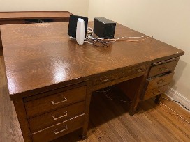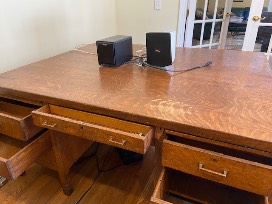 Unique 5.5 x 4.5 Wood Double Side Partners Office Desk. This is a sturdy solid oak desk, with a hole cut in the middle for wires. It has 12 drawers along with pull out shelves on either side. There are some signs of wear, but it does not diminish the value of this great piece for a home office.