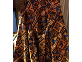 This ethnic skirt with matching handbag & headwrap will bring many compliments. One size fits most elastic waistine with an attached halfwaist belt. Beautiful in orange (primary), royal blue, black and white accent colors. This is for the fashion dresser!