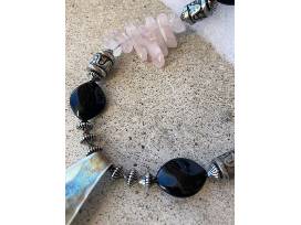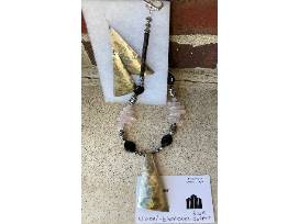 A one-of-a-kind necklace with onyx and rose quartz and nickel with a beautiful elongated pendant and earrings.