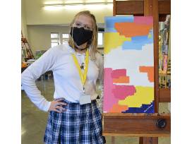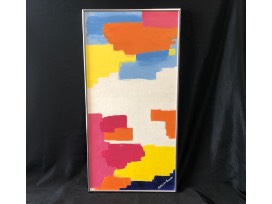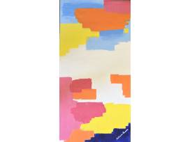 A colorful abstract painting. This piece is done in acrylic paint and measures 15x30.