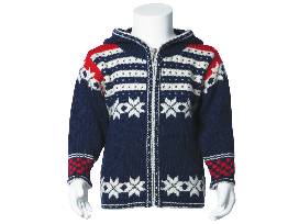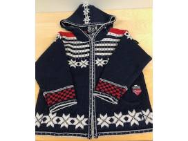 This genuine Norwegian hooded wool sweater with traditional Norwegian patterns in navy, white and red was donated by Ingebretsen's Nordic Marketplace This children's sweater made by Norlender Fanaf-Jellet and comes in size 4-6.