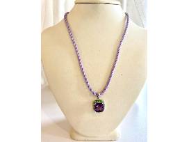 Cushion cut amethyst set in 14k white gold surrounded by tsavorite garnets on silk cord.