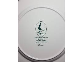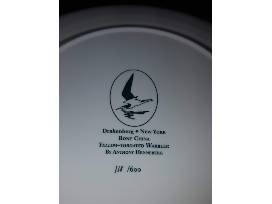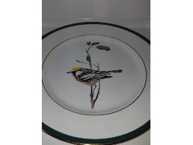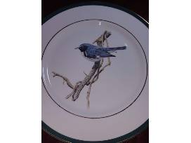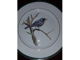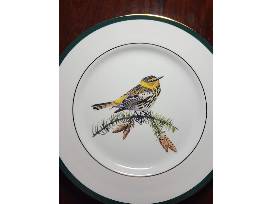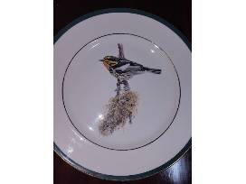 A collection of limited edition plates featuring warblers, designed by Anthony Henneberg for Drakenberg of New York. Each of these round plates features an image of a different perching bird at the center, with a dark green border and gold tone accents. The back of each plate is marked with 'Drakenberg New York Bone China', the species of bird depicted and 'By Anthony Henneberg' and is hand-numbered 118 of 600. This collection includes plates depicting the ovenbird, the black-throated green warbler, the yellow-throated warbler, the golden-winged warbler, the chestnut-sided warbler and the Blackburnian warbler, along with two plates depicting the black-throated blue warbler.