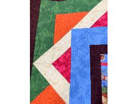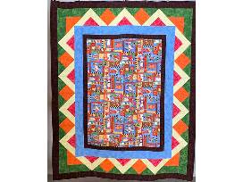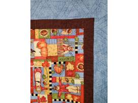 Fall Fun Lap Quilt, 54" x 64", Fall / Halloween theme print panel of scarecrows, pumpkins, sunflowers and leaves with colorful pieced border. This is a gorgeous quilt! The borders around the central panel dynamically accentuate the entire Thanksgiving theme. The colors are bright, bold, and beautiful and blend perfectly. This quilt is truly a gift to the eye. The machine quilting pattern aligns with the fabric patterns and changes with each fabric. An impressive design with expert detailing.