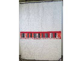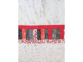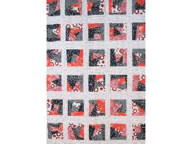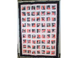 This is a twin-sized quilt, 64"x86". Very graphic utilizing only red, white, and black colors. Precise, detailed work. The reverse side is a sampler of fabrics and colors used on the front and balances the piece. A fantastic, unifying theme.