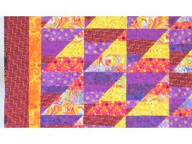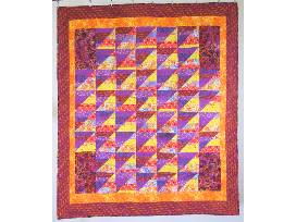 Vividly colored 54"x47" lap quilt is sure to put a smile on your face and on the world's as you go forward. Bright, sunshiny warm colors will keep you toasty warm all winter. Spicy, geometric shapes emblazon the front, and a panel of sun shaped discs float over the reverse side.