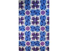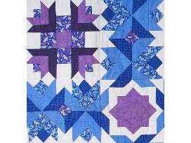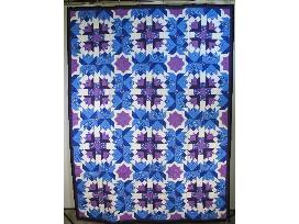 Purple, white, and blue quilt. 65.5"x85.5", queen size. Stunning, quilt pattern, which is a combination of the bear paw and tulip patterns.. The colors come together beautifully, and the double border edge binds it perfectly. The purple and blue really pop against the white background. Hand stitched details, such as colorful threads showing on the back, add hand sewn touches.