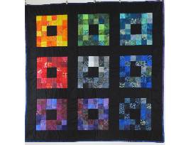 Larger: Wall-hanging, machine-pieced, hand quilted. 32"x32" Dramatic, graphic, rainbow squares, set against a black background. All set to hang, with included pocket for the hanger.