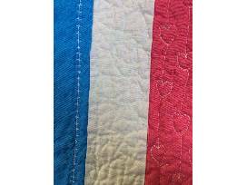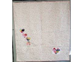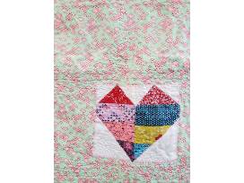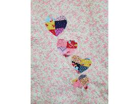 A 72"x77" quilted hug, in colors that will brighten any room. The quilting features strings of hearts in the sashing. Appliqued hearts on the back add more love.