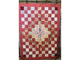 The fabric in this piece is both mild prints and solids using rust and beige colors. This comforter is hand tied. It covers a queen size bed and has a nice fluffy loft to keep you warm in the winter.