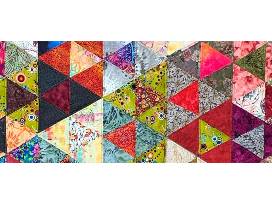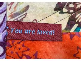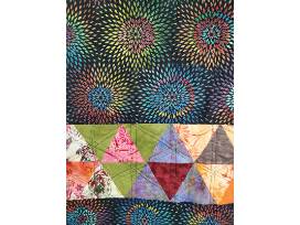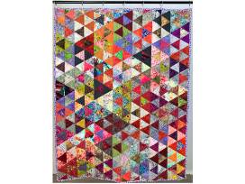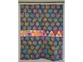 50"x62" quilt comprised of a variety of equilateral triangles with a purple and white binding, backed with black fabric of circular rainbow fireworks and a label stating "You are loved."