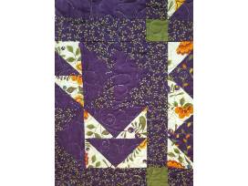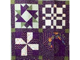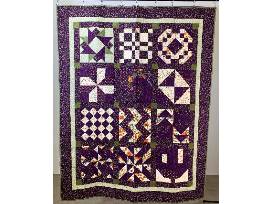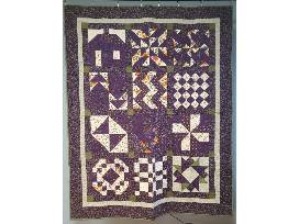 12 block sampler quilt. Made as a block of the month in Material Girls Quilt Guild in Baraboo, WI. 69"x54" This is a classic quilt design, expertly sewn. Lovely shades of purple, orange, and green, will warm your winters. The back is white with a contrasting thread which beautifully shows the quilting patterns.