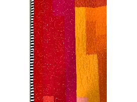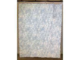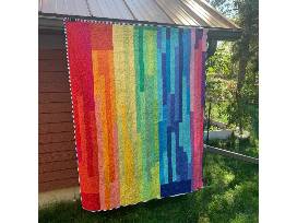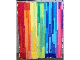 55" x 71" Scrappy rainbow strip quilt w/ black and white stripe binding and blue sky-cloud backing. Fun design of rainbow colored strips, forming a colorful rainbow across the quilt front. The reverse side is a lovely, bright blue sky, reminding us that "somewhere over the rainbow skies are blue and the dreams that you dare to dream really do come true".