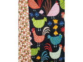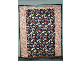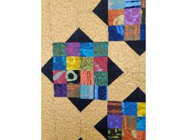 A lively mix of Marcia Derse fabrics used in the 16-patch blocks, set on a background of black and soft gold. Lap quilt with dimensions 59"x71"