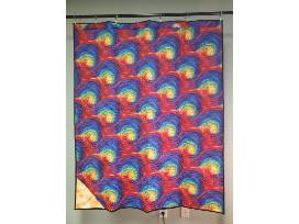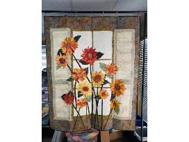 Wall-hanging w/sunflowers and bright rainbow backing. 48"x60" Tall sunflowers, waving on their stems, in front of a window. The subdued shades will blend nicely in any room. The reverse side is all rainbow swirls.