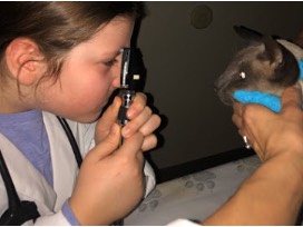 Donation includes kid-sized lab coat with veterinary emblem to keep, examining a dog and cat, and doing lab tests with microscope. The ultimate expedition!