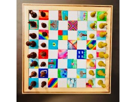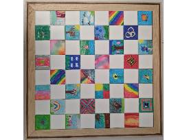 The 3rd grade class designed this colorful chess set by decorating 2 inch tiles using permanent markers. The chess board is wrapped with a frame of maple and walnut made by their teacher, Mr. Blank. The chess pieces are a high polymer weighted chess set. The chess set comes with extra queens. The king is 3" high. The total weight of the chess pieces is 1.3 pounds.