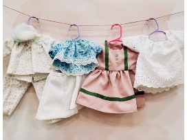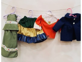 This set of handmade doll clothes will have any 18" doll looking fabulous every day of the week! Includes nine outfits and a pair of slippers to wear with matching pajama set.