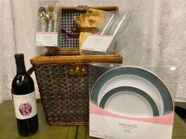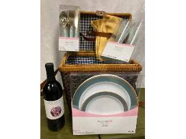 Beautiful wicker picnic basket with 4 silk napkins, 4 plates, plastic utensils, bottle of red wine and 2 plastic wine glasses