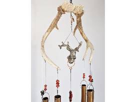 A unique Sportsman's Wind Chime. This chime is 36" long overall. The head is antlers that have copper & brass tubing hung on coated stainless cables w/ assorted bone beads. In the center is suspended a deer coat hook. From this the silver-plated snowflake clapper is hung. The sail is a horn link from a vintage belt w/ a bone bead. Unique, custom, handmade wind chime. The artist likes to upcycle & repurpose found objects in a creative way to make his individual wind chimes.