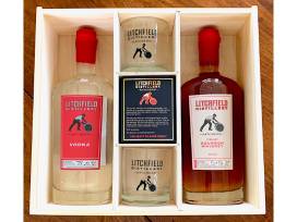 - A Litchfield Distillery wooden gift box with a bottle of their Bourbon Whiskey, a bottle of their Vodka and two glasses.
