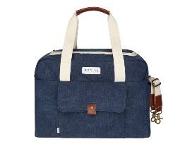 The Birdling "Overnighter" Bag is made from durable canvas in indigo blue with leather trim. Three exterior pockets and two interior side by side structured compartments will keep you super organized. Includes a large flap opening with zippered pocket and padded removable shoulder straps. Measures: 17"L x 12.5"H x 9.5D"