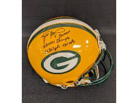Green Bay Packers game helmet autographed by living legend Brett Favre! Signature includes "Brett Favre - 4 - 3x MVP - SB XXI Champs - 61 - 367 yards - 421 TDs" - no COA.