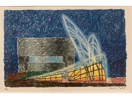 Elegantly framed, signed and numbered (5 of 6) print of the César Pelli's rendering of the National Museum of Art Osaka. César Pelli designed the National Museum of Art Osaka. Size is approximately 25 1/8" h x 31 7/8" w.