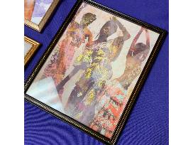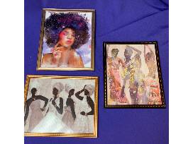 Three Special Moments African art prints in simple gold frames. Horizontal print size is approximately 8 6/8" h x 10 5/8" w and vertical print size is 10 5/8" h x 8 6/8" w.
