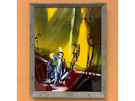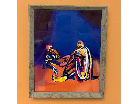 Set of three framed digital art prints entitled "Man and Horse Play," "Kindness in a Stranger," and "Blue Grounded in Orange" by local LGBTQ+ nonbinary artist Maxwell Kale. Print sizes are approximately 10 1/2" h x 8 1/2" w.