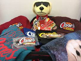 - Raising Cane's Chicken Fingers: 1 Party Cooler, 1 Cane Plush Puppy, 2 Raising Cane's Logo Keychains, 2 Short Sleeve Tees, 1 Koozie - Black and Gold, 1 Koozie - Red and White, 3 Free Box Combo Cards, 2 Free Kids Combo Cards, 1 Free Lemonade Card, 4 Raising Cane's Logo Magnets, 2 Lip Sauce Lip Balms, 2 Click Pens, 2 Hats