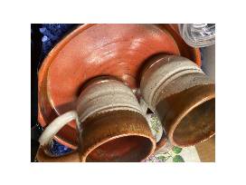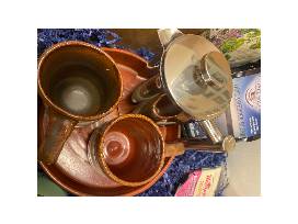 For Coffee Lovers, this Perfect Blend Gift Basket includes a BAYKA steel French coffee press 21oz, 2 handcrafted artisan mugs and salad plate by Jeff Lewis, 5# NW Coffee Mills Organic Oredock Dark Blend Coffee, 2 waffle energy bars, 1 travel coffee mug with lid, 1# box assorted chocolates from Gabriele's German Sweets, spring napkins