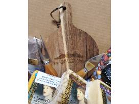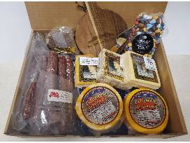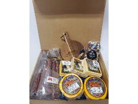 Pepperoni from Trinko Sausage, Five Cheese Assortment from Benoit Cheese Haus and Chocolate Bark from Gabriele's German Sweets. Plus Lake Superior chocolate "rocks" and a wooden Big Top logo branded cheese board/cutlery.