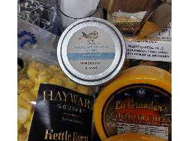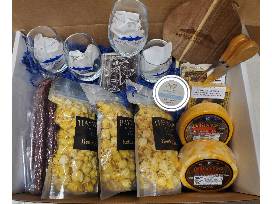 This bundle brings together a variety of treats including: Pepperoni from Trinko Sausage, Five Cheese Assortment from Benoit Cheese Haus, Chocolate Bark from Gabriele's German Sweets, Three personal-sized bags of Kettle Corn from Hayward Gourmet popcorn.