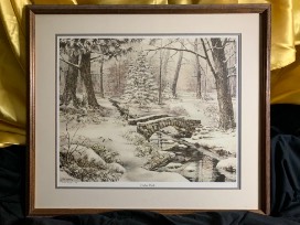 1987 Oak Framed William Mangum Fisher Park landscape print in black, white, gray scale, double matted in ecru and steel grey, behind glass. 28" X 24" One of 750