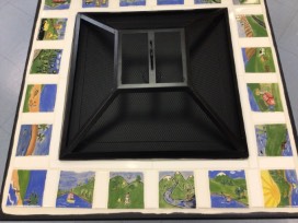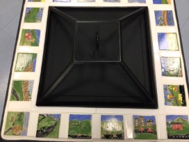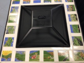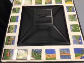 This self contained metal fire pit has been customized by our students with individually hand painted tiles. You will enjoy many an evening gathered around this pit while enjoying the children's art work.